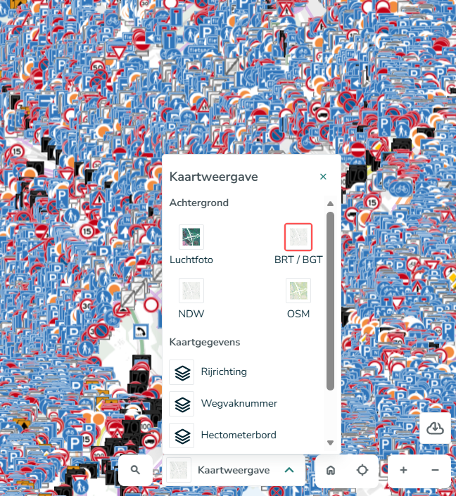 De BRT[1] is de standaard gebruikte laag. Wanneer je kaarttype OSM[2] of luchtfoto's[3] kiest kun je verder inzoomen dan op de BRT. Zo kun je bijvoorbeeld specifieker een bord plaatsen.